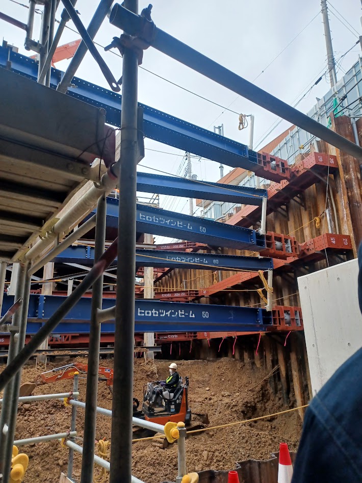 頭上を走るJRの線路の走行音もなく、見上げるほどの高さまで組まれた支保工(工事を支えるジャッキや鉄骨)の数々。まるでSF映画のセットのような迫力に、思わず言葉を失いました。