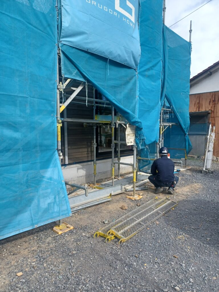 本日は、戸建賃貸住宅の新築現場にて、外部足場の解体作業を行います。