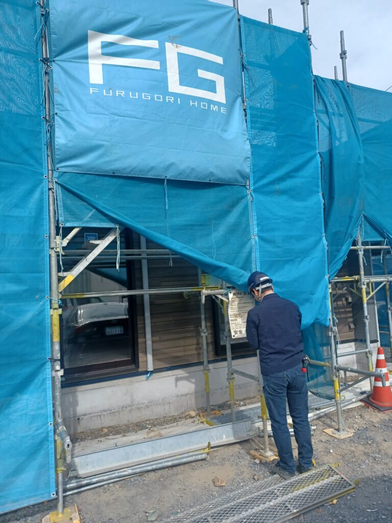 写真の通り、現場監督が一枚一枚シートの固定具を外し、安全を確保しながら作業を進めています。足場の解体は一見単純に見えますが、実はとても繊細な工程です。窓サッシや外壁材を傷つけないよう細心の注意を払いながら、外周部を確認しつつ作業を進めていきます。座り込んで細部をチェックする姿からも、丁寧な現場づくりへのこだわりが伝わってきます。